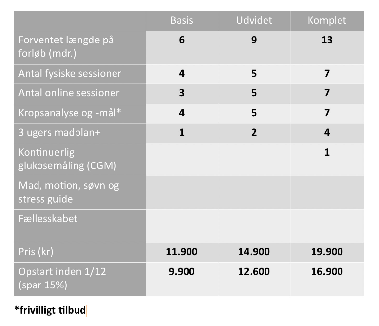 Det præcise fokus, vægtning af indhold og omfang vil afhænge af dig og din problemstilling – og vil blive tilpasset dig, dine ønsker og dine behov. Du kan vælge mellem tre pakker: Basis, Udvidet eller Komplet, som varierer i indhold og omfang: